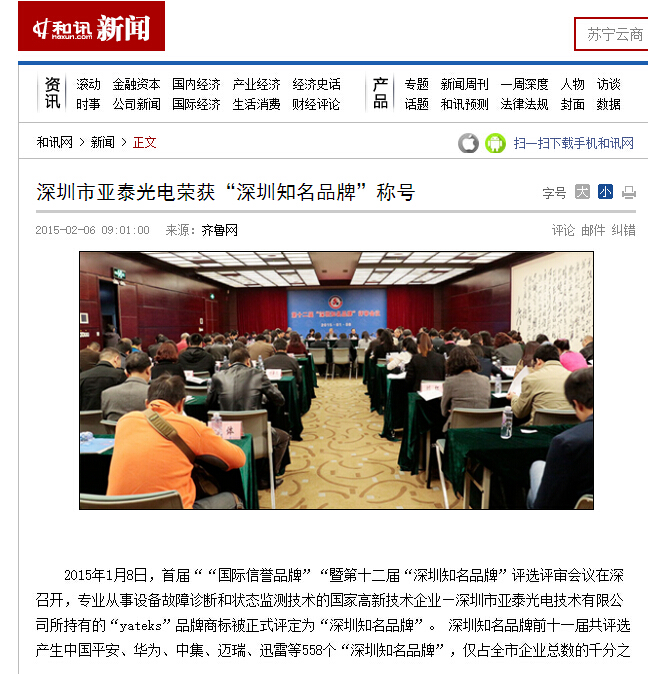 2015年1月8日,首屆““國際信譽品牌”“暨第十二屆“深圳知名品牌”評選評審會議在深召開,專業(yè)從事設(shè)備故障診斷和狀態(tài)監(jiān)測技術(shù)的國家高新技術(shù)企業(yè)—深圳市亞泰光電技術(shù)有限公司所持有的“yateks”品牌商標被正式評定為“深圳知名品牌”。 深圳知名品牌前十一屆共評選產(chǎn)生中國平安、華為、中集、邁瑞、迅雷等558個“深圳知名品牌”,僅占全市企業(yè)總數(shù)的千分之一。