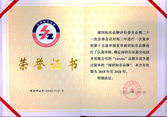 深圳市亞泰光電技術有限公司致力于成為全球領先的工業內窺鏡和油液監測產品的研發和制造商,公司于2015年1月通過評審,獲得“深圳知名品牌”稱號!此次復審順利通過,既是亞泰光電堅持品質如一、不斷進取的結果,同時也說明了亞泰光電產品在業界內的知名度、美譽度和影響力!