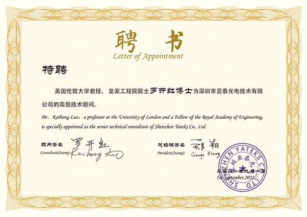 風(fēng)勁帆滿海天闊,牽手闊步新征程!2021年9月1日,深圳市亞泰光電技術(shù)有限公司特聘英國倫敦大學(xué)教授、皇家工程院院士羅開紅博士為高級(jí)技術(shù)顧問。亞泰光電總經(jīng)理鄭翔為羅開紅博士頒發(fā)了聘書。