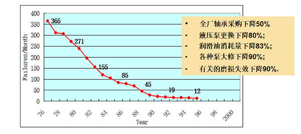日本新日鐵公司在1980-1986年的六年間由于加強潤滑監(jiān)測與管理,使設備失效率下降了65%。