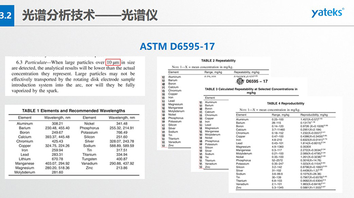 光譜儀的優(yōu)劣勢(shì):優(yōu)勢(shì):1)速度較快40秒;2)精度高PPM微量級(jí);3)取樣少,可同時(shí)進(jìn)行多元素   測(cè)定,適用范圍廣; 4)自動(dòng)化程度高,有多種連鎖保護(hù)。弱勢(shì):1)檢測(cè)的磨粒尺寸比較小,2微米效率最高,最大尺寸不超過(guò)10微米; 2)不能提供磨粒的形態(tài)、尺寸、顏色等直觀形象的信息,因此光靠光譜分析的結(jié)果直接對(duì)摩擦副的狀態(tài)作出判斷有很大的困難; 3) 價(jià)格較貴。