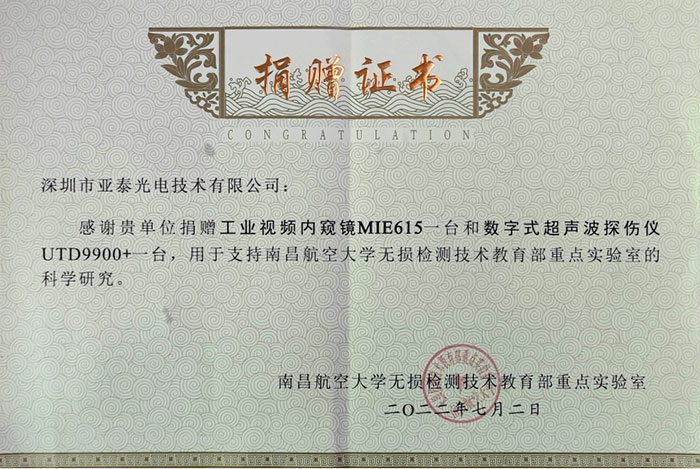據悉,本次捐贈的兩臺設備為亞泰光電工業視頻內窺鏡MIE615和數字式超聲波探傷儀UTD9900+,價值約6萬元。工業視頻內窺鏡MIE615是一款機械360°轉向視頻內窺鏡,用于各種狹小空間的目視檢測工作。機身輕便便于攜帶,插入管可更換結構,一臺主機可搭配不同規格直徑的插入管,既滿足了客戶多方面的使用需求,又可以大大節約設備費用。可廣泛應用于發動機、電力、石化、鐵路、船舶等領域。數字式超聲波探傷儀UTD9900+它能快速低成本地探測工件內部裂縫,夾雜,氣孔,疏松等多種缺陷,廣泛用于機械制造,鋼結構,化工設備,造船,壓力容器等領域進行質量控制的有力工具。它較好地解決了有些數字式儀器操作不方便的問題。