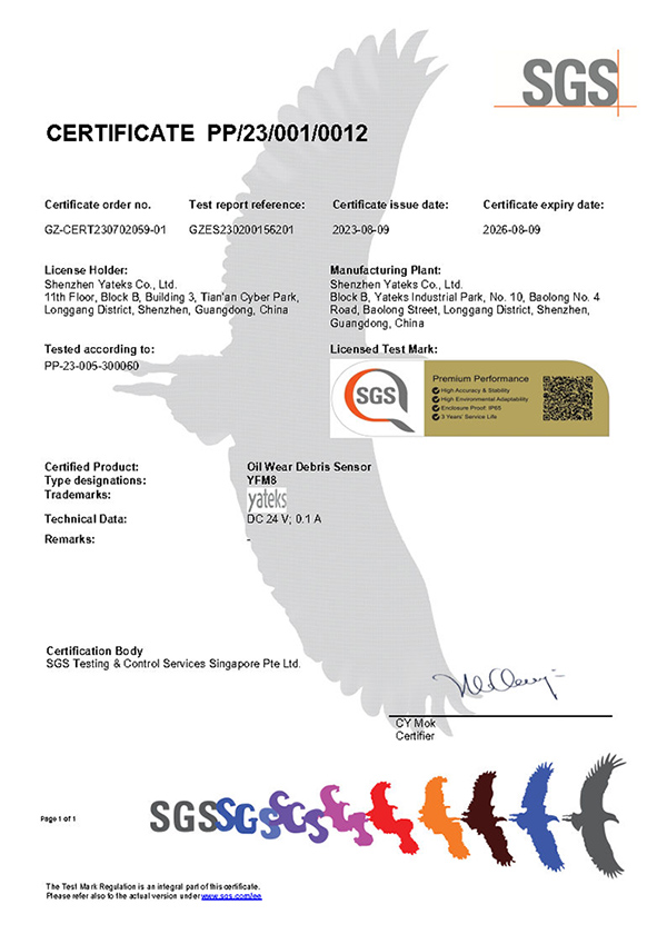 亞泰光電油液金屬磨粒傳感器通過(guò)了SGS嚴(yán)格的高低溫、濕熱循環(huán)、沖擊振動(dòng)、包裝跌落等環(huán)境類測(cè)試,以及包括EMC和安全性在內(nèi)的法規(guī)類測(cè)試。經(jīng)測(cè)試驗(yàn)證,傳感器的壽命和功能性符合宣稱,最終取得了SGS頒發(fā)的首張傳感器性能認(rèn)證(Sensor Trust)項(xiàng)目Premium Performance證書(shū)。