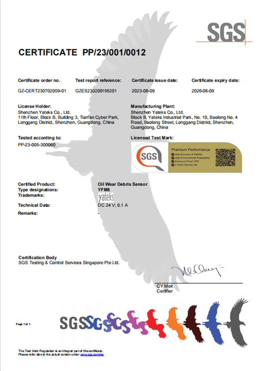 標(biāo)定和量的索源是油液監(jiān)測的保證亞泰光電擁有完善標(biāo)定儀器的油液實驗室,油液傳感器經(jīng)過獲得標(biāo)準(zhǔn)樣品、設(shè)置標(biāo)準(zhǔn)樣品、測量標(biāo)準(zhǔn)樣品、校準(zhǔn)傳感器、驗證標(biāo)定結(jié)果、記錄標(biāo)定等步驟,最終獲得高準(zhǔn)確度的油液傳感器。亞泰光電和SGS達(dá)成了深度戰(zhàn)略合作,金屬磨粒檢出率可達(dá)95%以上,獲得了SGS頒發(fā)的全球首張傳感器性能金標(biāo)認(rèn)證(Sensor Trust)。