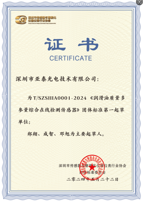 在《深圳市培育發(fā)展智能傳感器產(chǎn)業(yè)集群行動計劃(2022-2025年)》的指導(dǎo)下,傳感器企業(yè)越來越成為深圳國民經(jīng)濟(jì)和社會發(fā)展的新質(zhì)生產(chǎn)力,但與此同時,在潤滑油在線檢測傳感器領(lǐng)域并沒有具有針對性的指導(dǎo)標(biāo)準(zhǔn)。亞泰光電牽頭起草全國首個油液監(jiān)測傳感器器團(tuán)體標(biāo)準(zhǔn)(T/SZSIIIA0001-2024),已實施并出版(由中國標(biāo)準(zhǔn)出版社出版發(fā)行,各地新華書店經(jīng)銷)。這是對深圳市亞泰光電技術(shù)有限公司和相關(guān)潤滑油狀態(tài)監(jiān)測傳感器企業(yè)提出了更高的要求。它將推動傳感器技術(shù)的創(chuàng)新、促進(jìn)潤滑油行業(yè)的數(shù)字化轉(zhuǎn)型、加強行業(yè)間的合作與交流,并提升我國在全球潤滑油市場的地位。隨著標(biāo)準(zhǔn)的深入實施和應(yīng)用,相信我國潤滑油行業(yè)將迎來更加廣闊的發(fā)展前景。