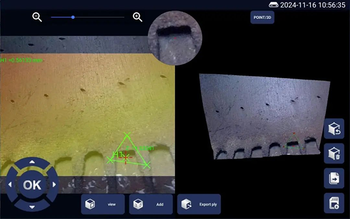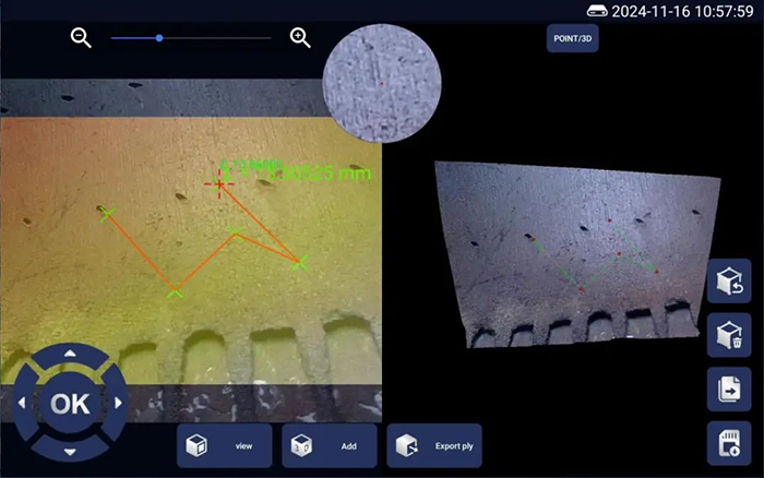 亞泰光電三維內窺鏡的核心突破在于高精度三維建模與實時測量。其搭載的雙目立體成像技術,可生成3D點云圖、深度圖和剖面圖,最小測量精度達到0.01mm,遠超傳統二維檢測的局限。