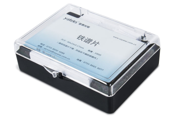 鐵譜片,分析式鐵譜儀耗材,用于油品定性分析——鐵譜分析制譜用。油樣經(jīng)虹吸泵引導(dǎo)流入鐵譜片,在高梯度磁場作用下,油品中的鐵磁性顆粒會按照規(guī)律排布于鐵譜片的U型槽內(nèi)。
