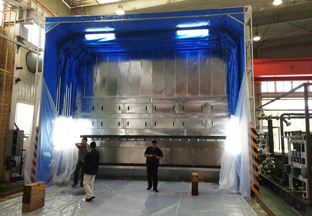 在噴漆房不移動一端安裝有水簾式噴漆柜,噴漆產生的漆霧通過水簾凈化或排放到車間外部,漆霧由水過濾或回到水池中,定期清除。